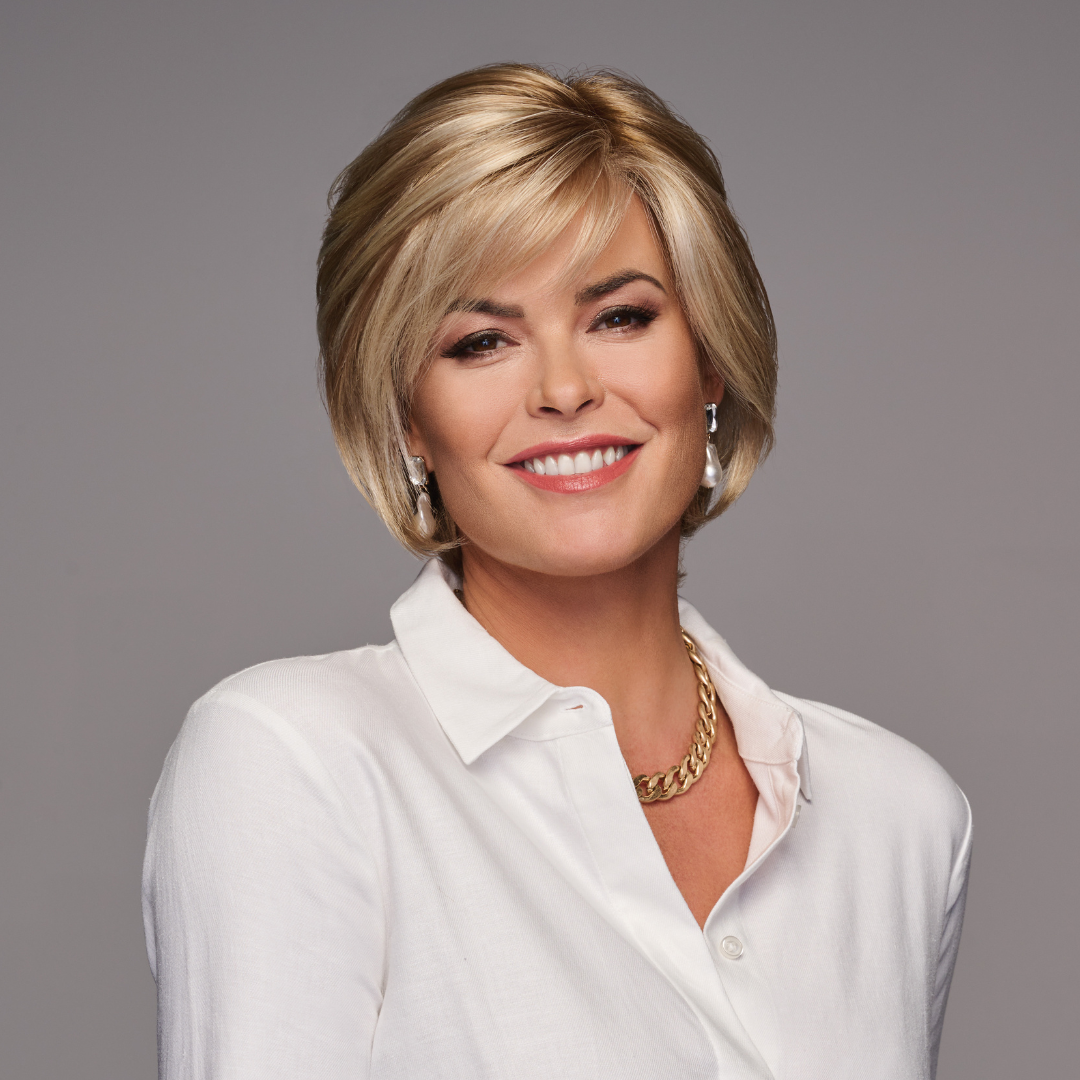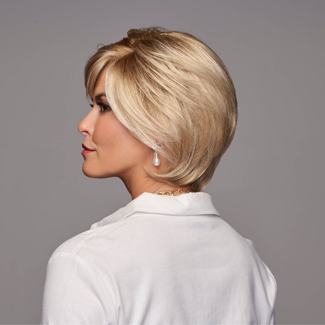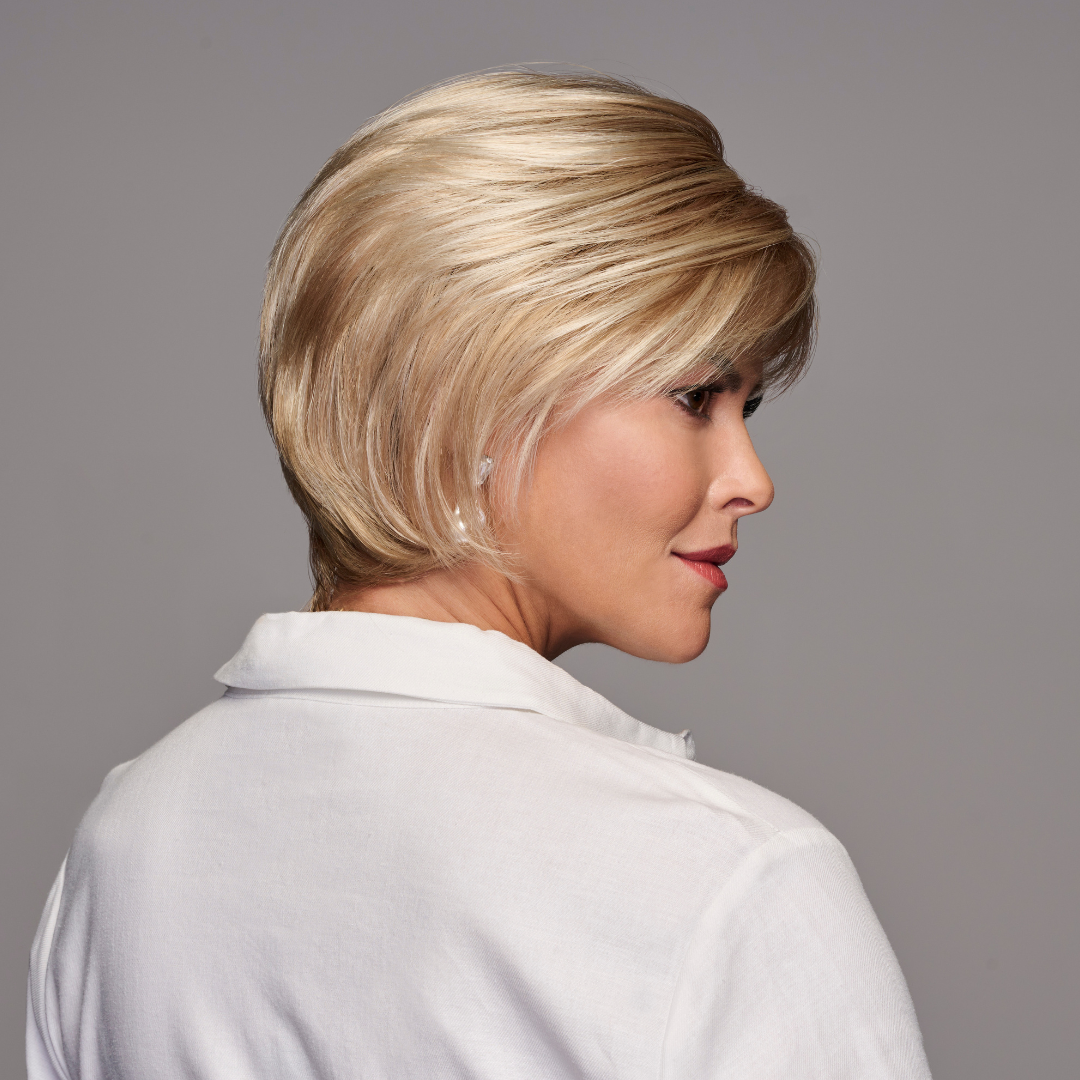 Get a fresh, chic and undone look with this textured cut. Features include soft layers throughout, a monofilament part, and razor-cut back and sides. The extended lace front allows you to wear with a soft fringe coming onto the face or swept up and away. Its all-over shattered texture and piecey bangs call attention to the eyes and make a lasting impression.