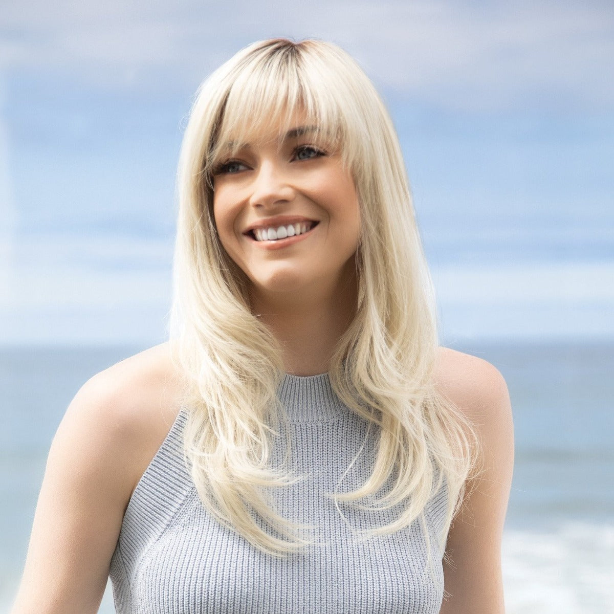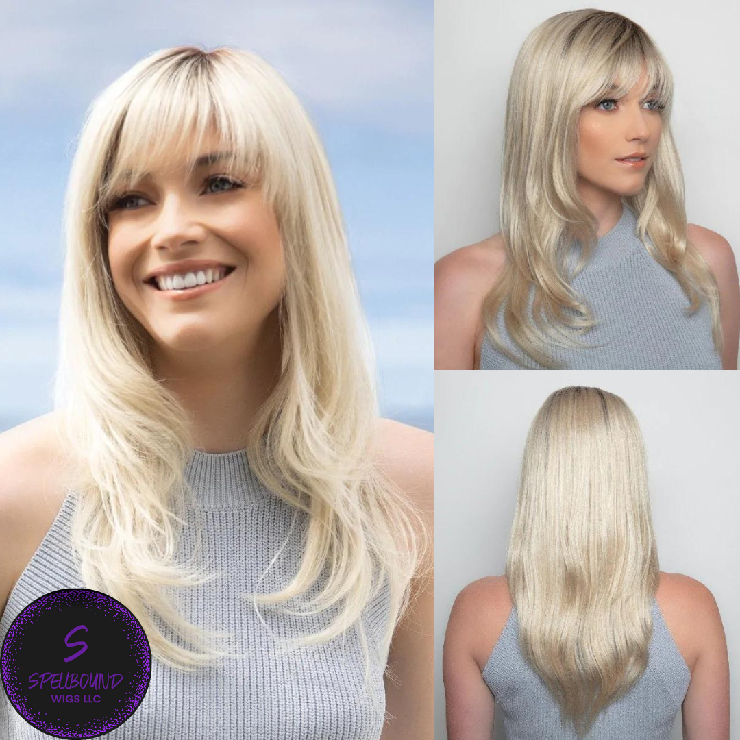 Angela from our Alexander Couture Collection is a long-length synthetic wig. This straight ready-to-wear wig is a flirty long layered style with wispy fringe.