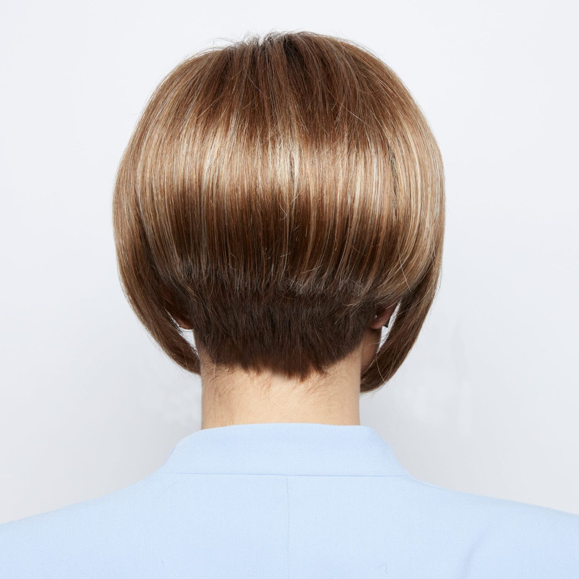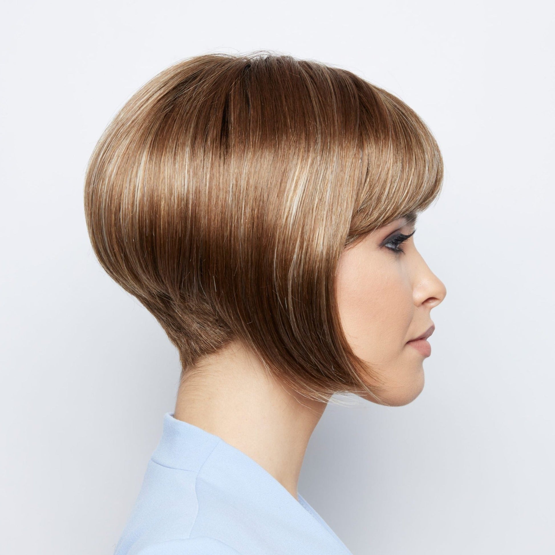 Angie from our Alexander Couture Collection is a short-length synthetic wig. This straight ready-to-wear wig is a sleek A-Line cut with full fringe.