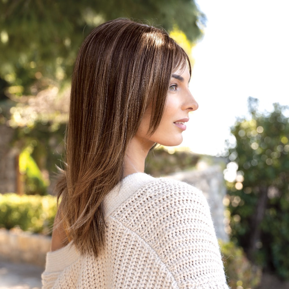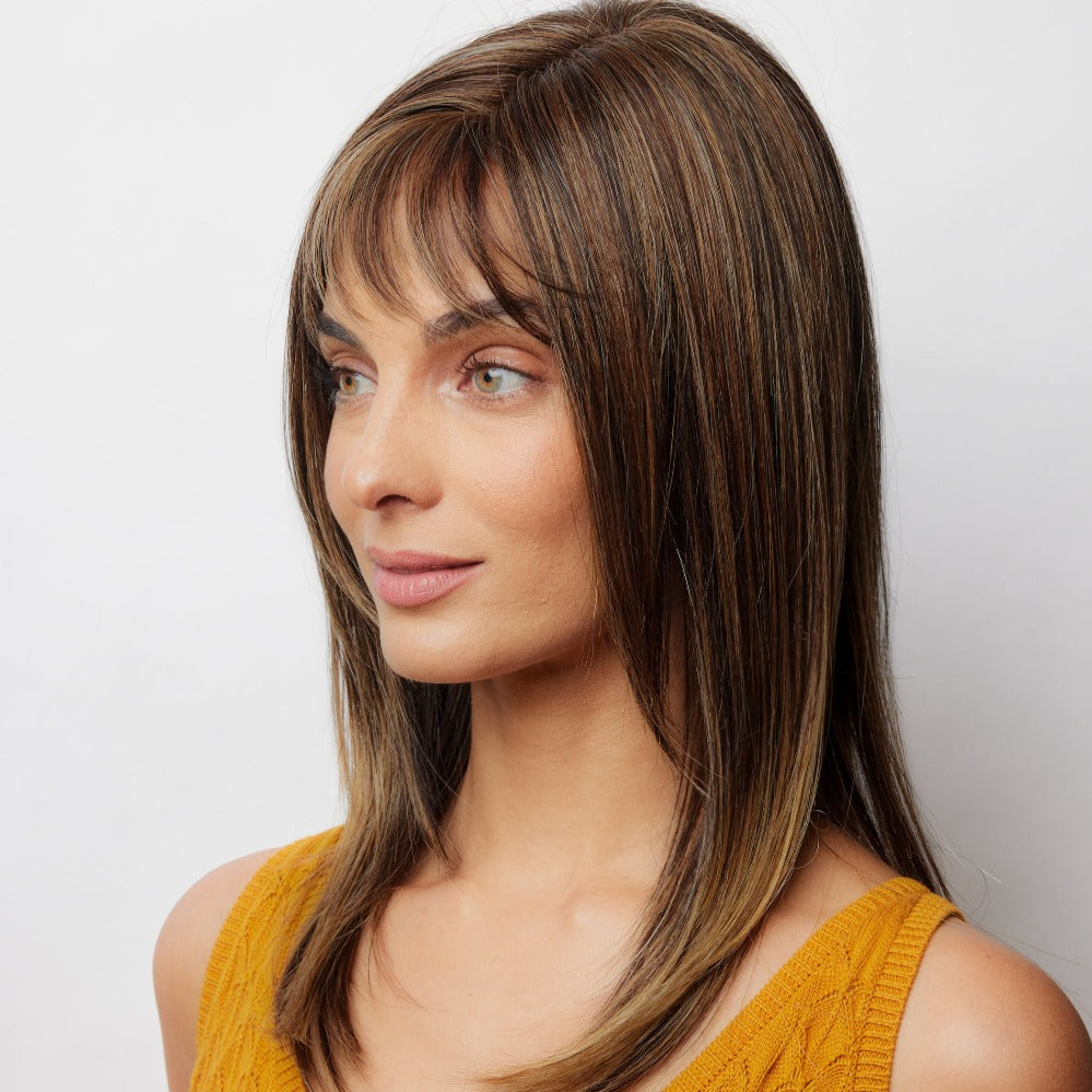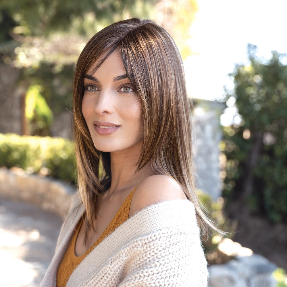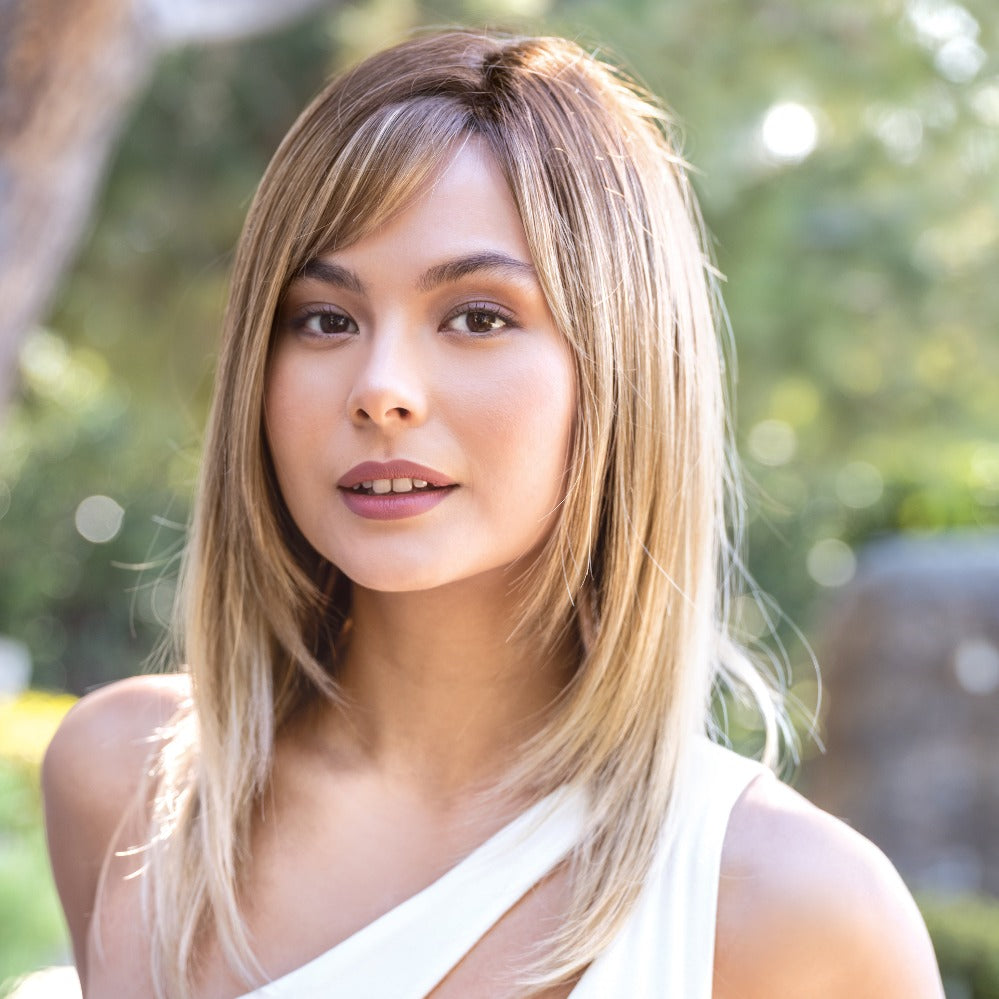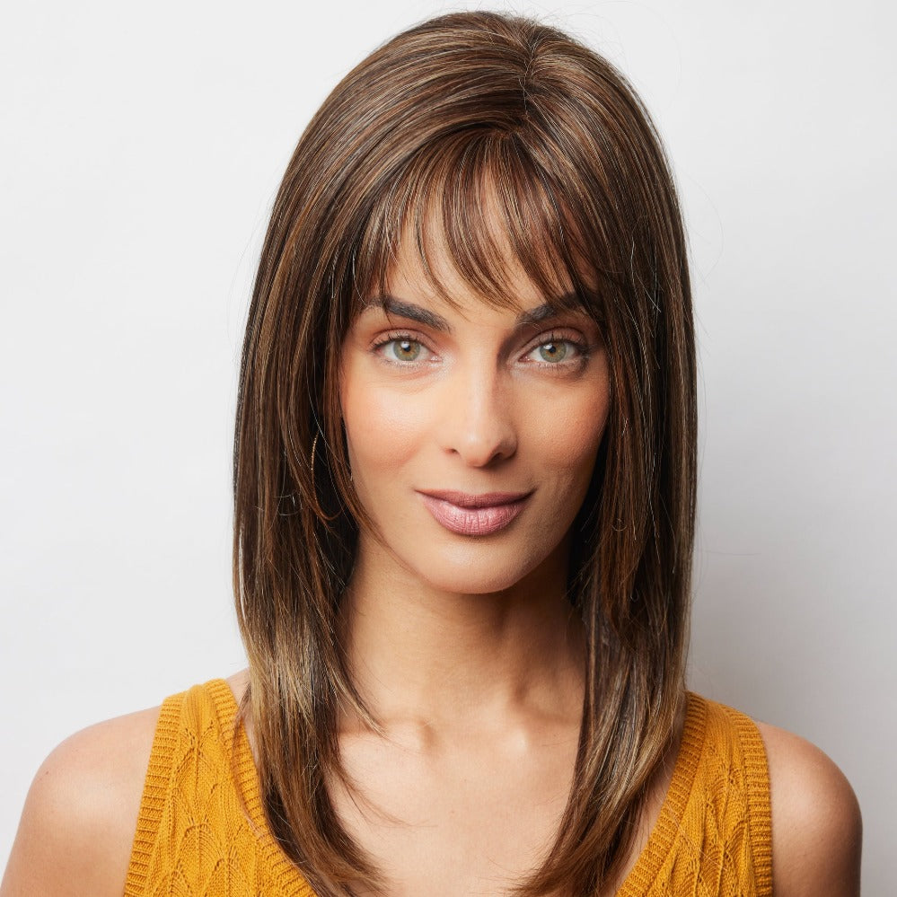 Arden from our Amore Collection is a medium synthetic wig. This straight ready-to wear wig is a youthful and inspirational style. If you are looking for a face- framing style with the option to change hair part and fringed base on personal preference this is your look. Our Arden cap construction is Deluxe Monofilament. Monofilament is covered with softnet material for softer/airy mesh for maximum comfort and breathability with lace front.?