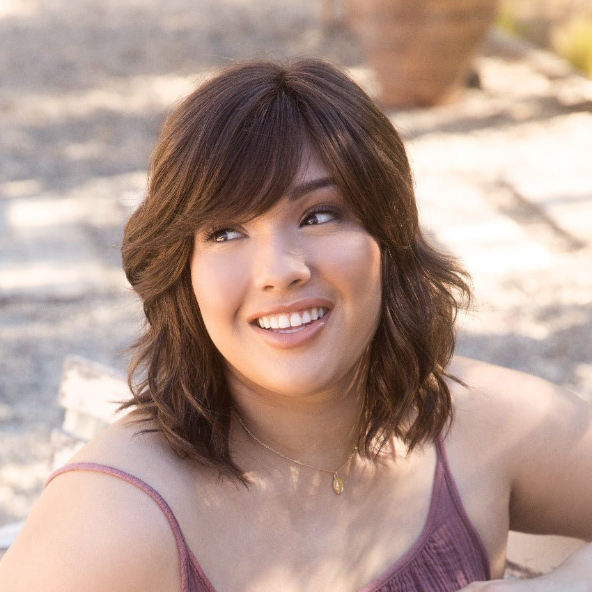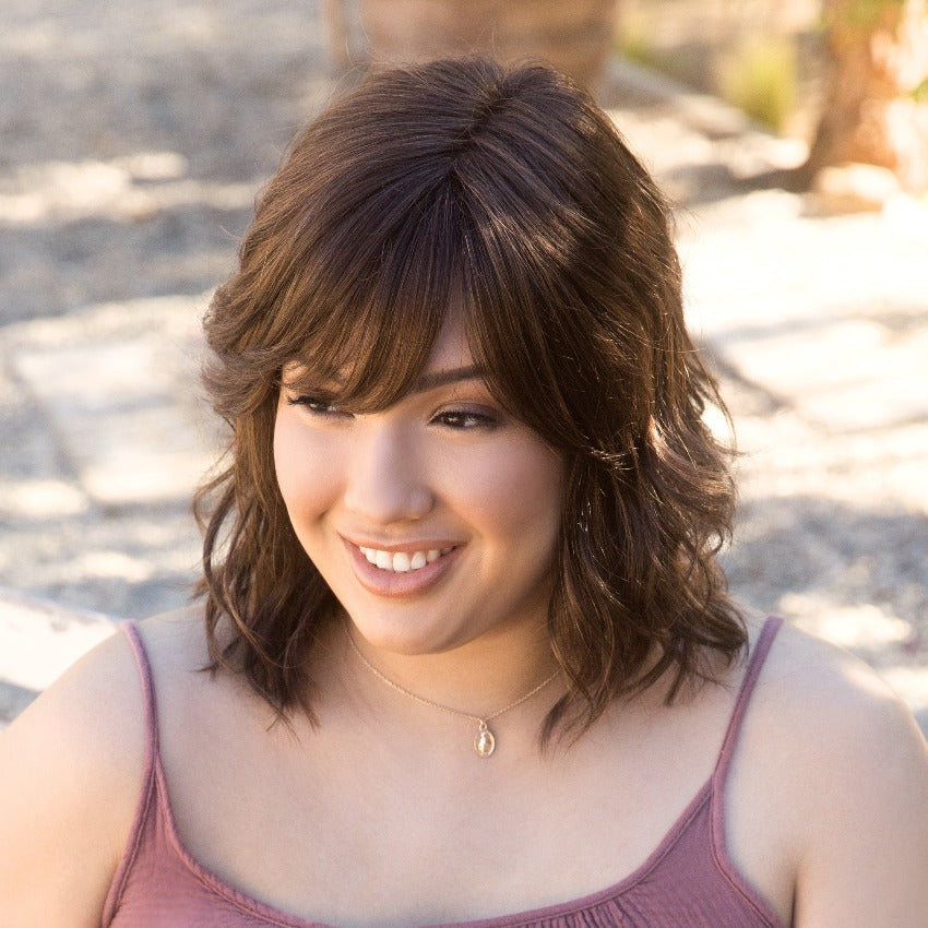 Braylen from our Amore Collection is a mid-length synthetic wig. This wavy ready-to-wear wig is a fun and playful wig with medium density. If you are looking for that beachy wavy curl pattern with fringe this is the wig for you. Our Braylen cap construction is Double Monofilament and lace front. The lace front is a hairline fusion technology with minimal lace front for a natural look. Its Double Monofilament cap construction is combined with calibrated machine wefting along the sides and back. Braylen cap includes polyurethane tape tabs along the front and adjustable tabs in the back neck area, to allow for comfortable fit. The result is a comfortable fit with a natural look that is both fashionable and easy to wear.