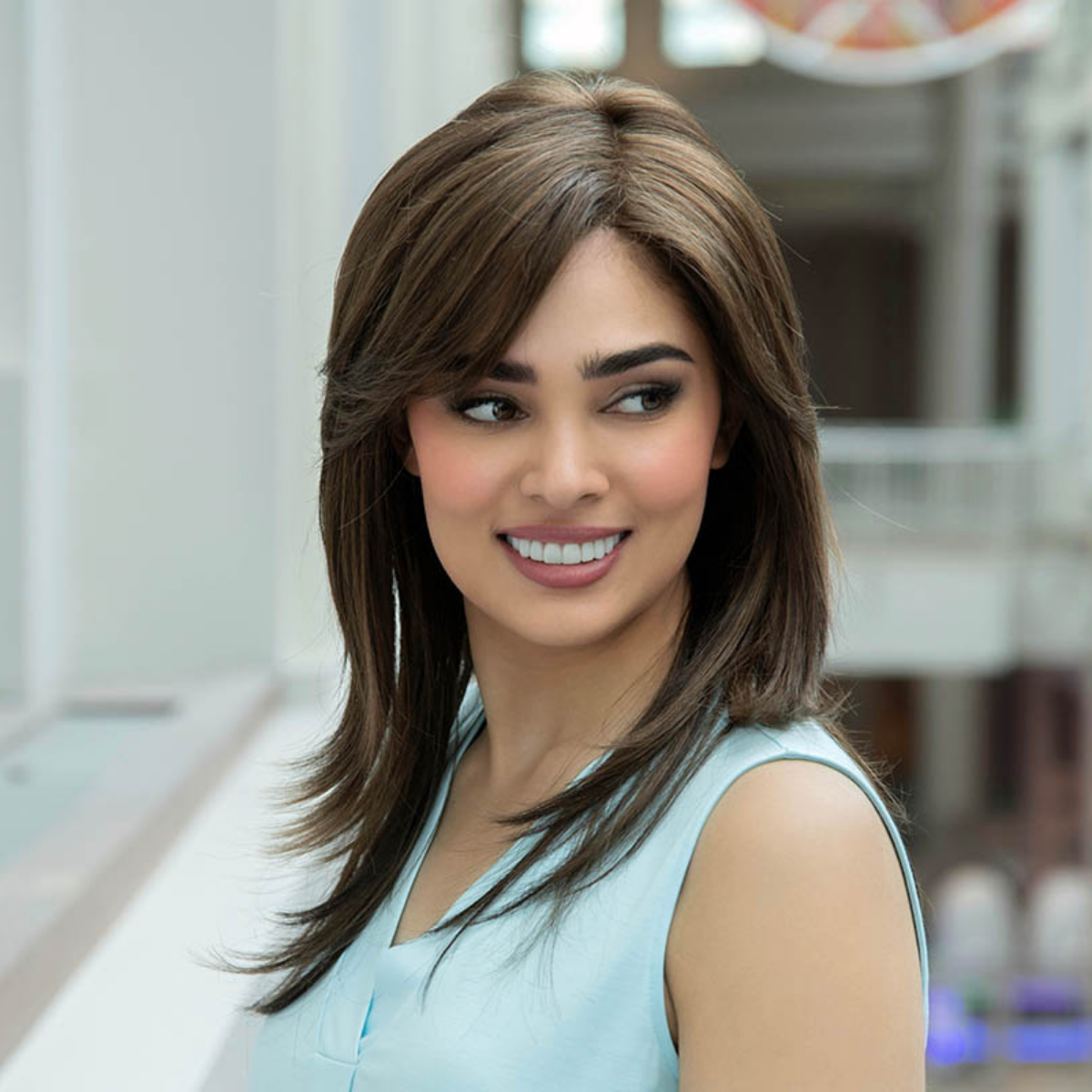 CELESTE by ENVY is a long, layered face-framing bombshell available in 25 fashion-forward colorations. Its individually Hand-Tied, Mono Top construction provides natural movement and the flexibility to comb its side-swept bangs back or towards the face.