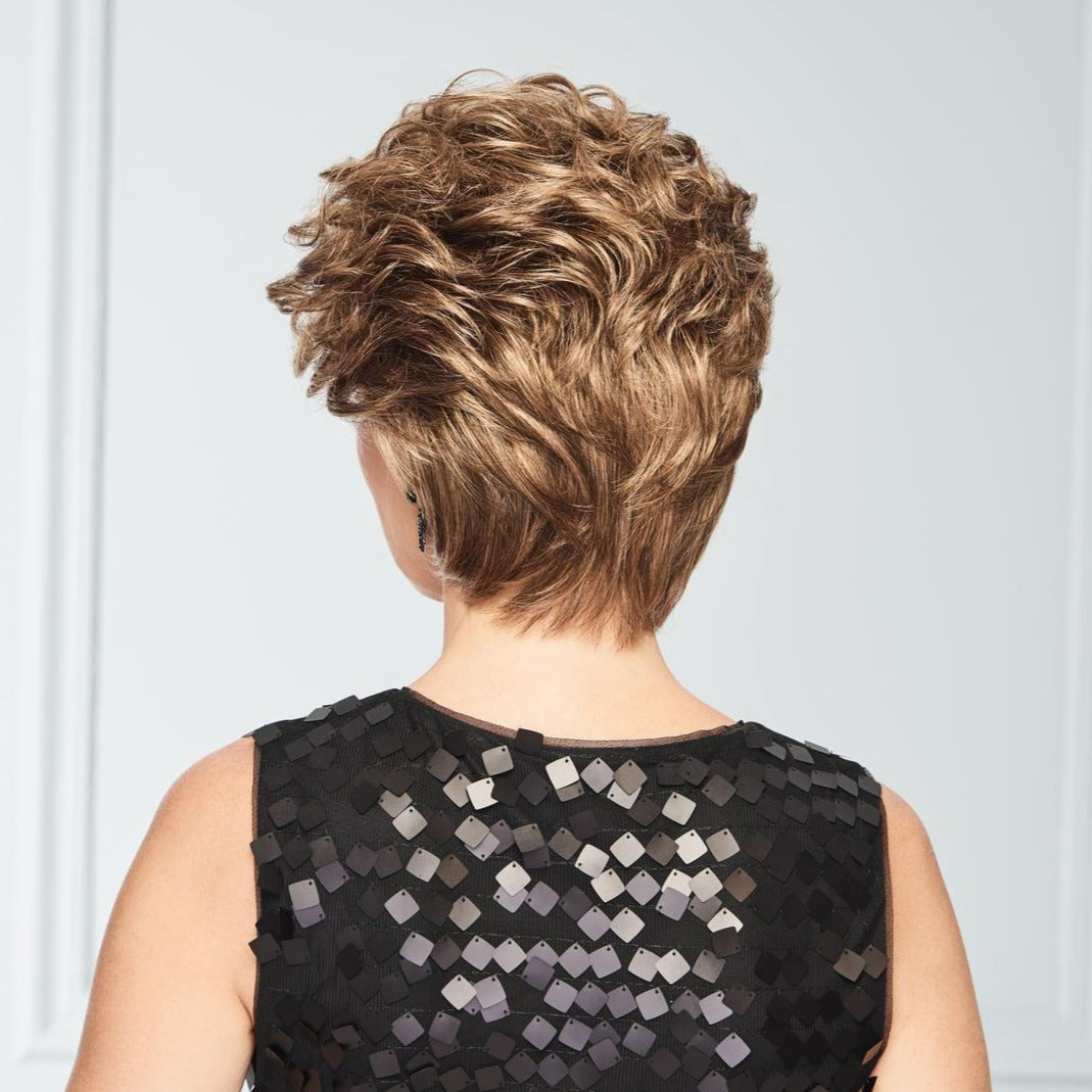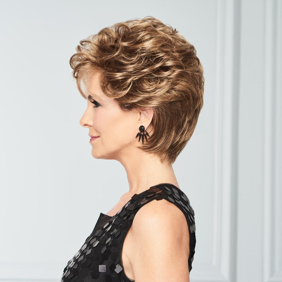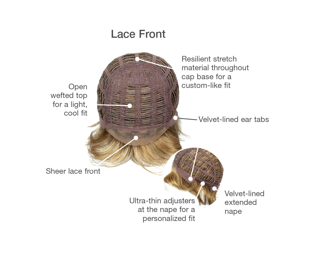Get full on volume with this multi-layered, sculpted cut. Soft, barrel waves throughout the top and sides combine with a sheer lace front for added styling versatility while the gently tapered nape gives a polished, tailored finish to the overall shape.