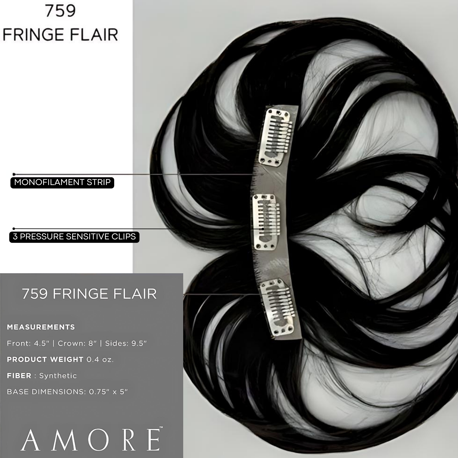 Fringe Flair from our Amore collection is a synthetic hair enhancer. This straight clip-in bang allows you to update your hair style with our sweeping asymmetrical 隆掳fringe隆卤 without cutting your hair. Update your everyday look without the commitment of cutting your own hair and adding a little fringe bang to it. Its Monofilament construction has 3 toupee clips and will give you a light, breathable base and provides the ultimate versatility and comfort.