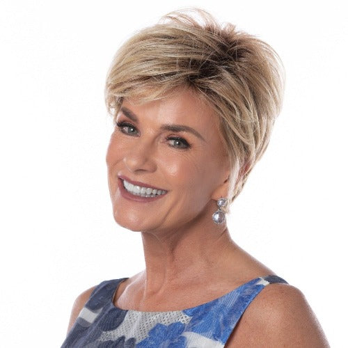 The Toni Brattin Jazzy Wig features a newly designed custom cut that reflects fashion and style made easy. Gentle airy layers on the crown that blend easily into a soft, razored neck line. A specially designed cap can be easily adjusted for a custom and comfortable fit with the sizing tabs in the neckline. Nylon wig cap and storage box included.
