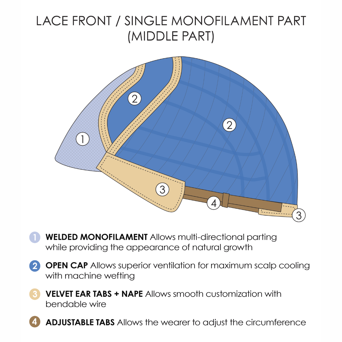 - Dimensions: Bang 4.25" / Crown 15-15.5" / Side 11.75"/ Nape 8.25"