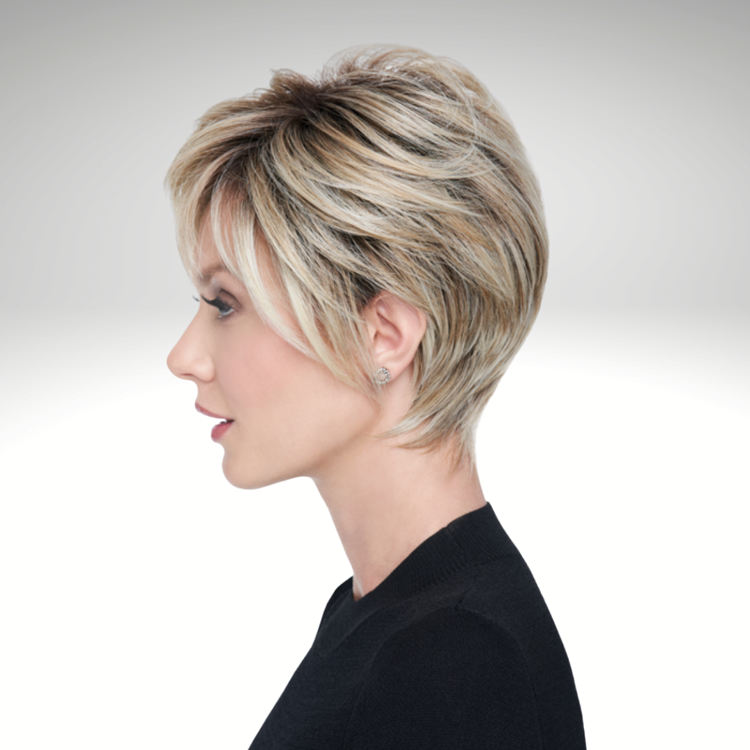 It¡¯s a win-win! This modern short cut has enough choppy length on top to give you a lift. And a little edge. Brush smooth and sleek or finger styled for a piecey look. A sculpted back and the slightly asymmetrical razor cut fringe adds an air of sophistication while the Sheer Indulgence? temple-to-temple lace front with monofilament part affords added styling options.