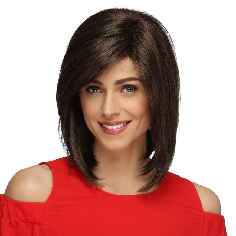Sky is both sexy and chic; the perfect amount of versatility all in one style. Her slightly angled layers and flowing side bangs make this shoulder length style simple and sleek for a perfect evening.