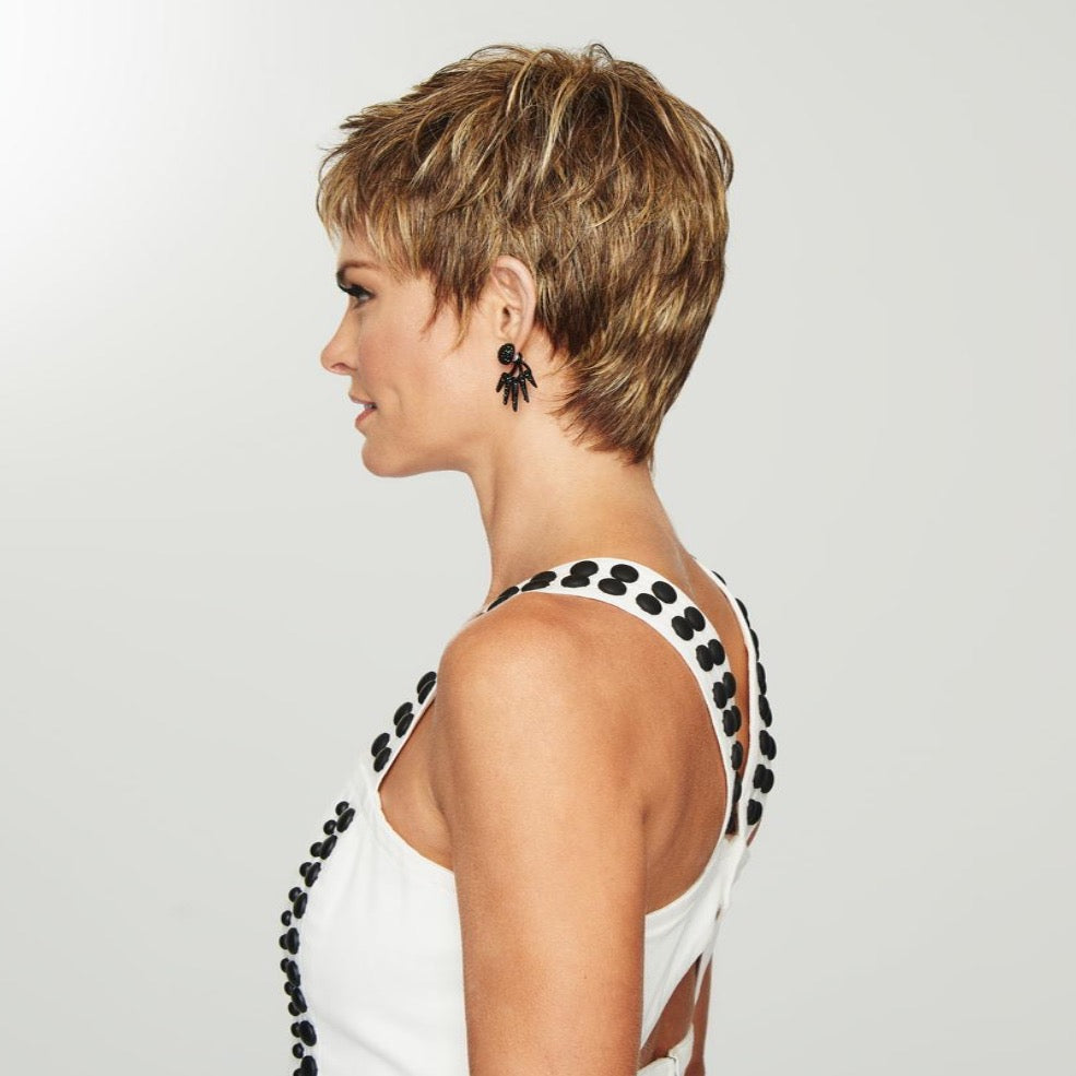Offering a light, cool fit with no-fuss styling, this short, slightly textured boy cut includes a barely curled top and crown, wispy, feathered bangs and expertly layered sides and back that blend into a neck hugging nape.