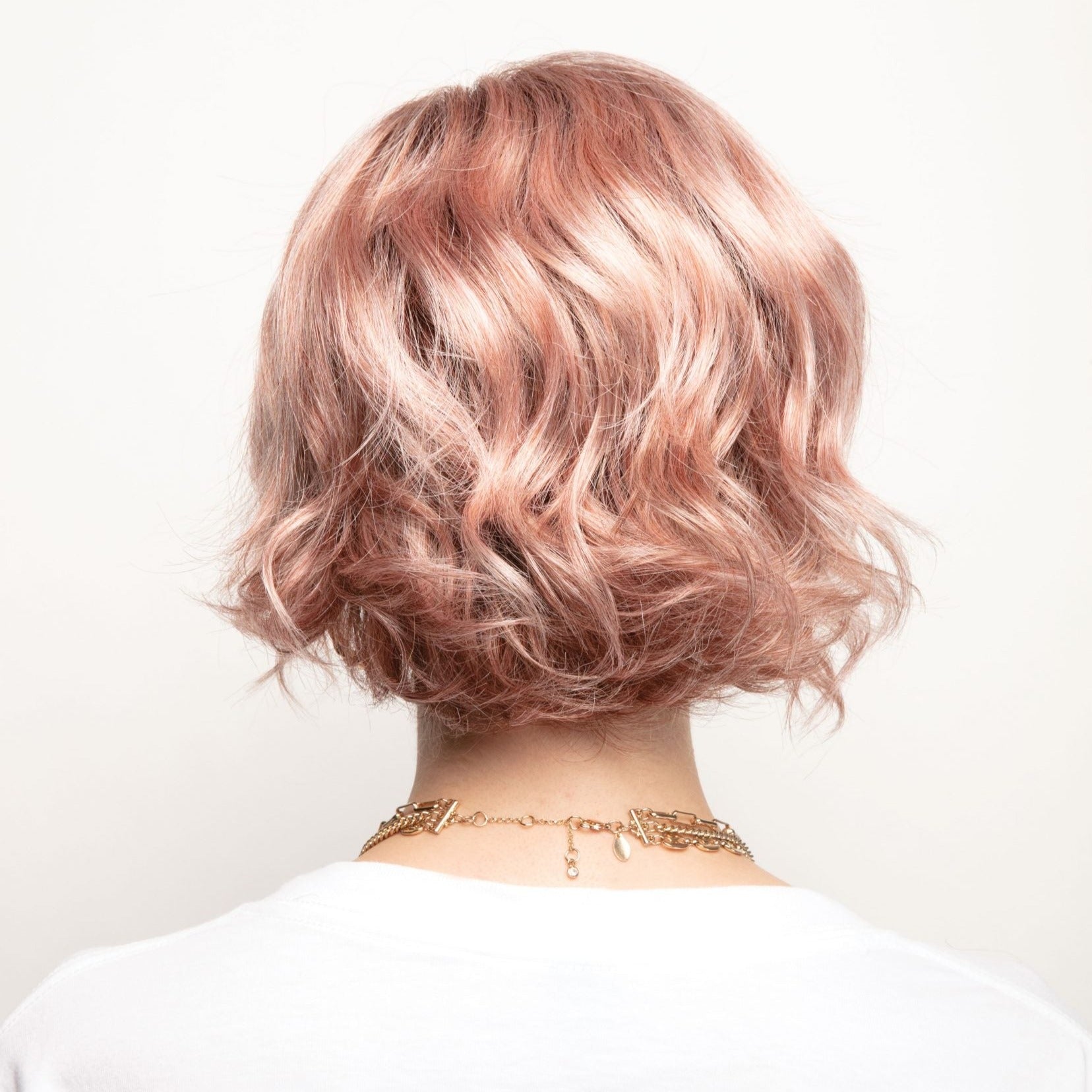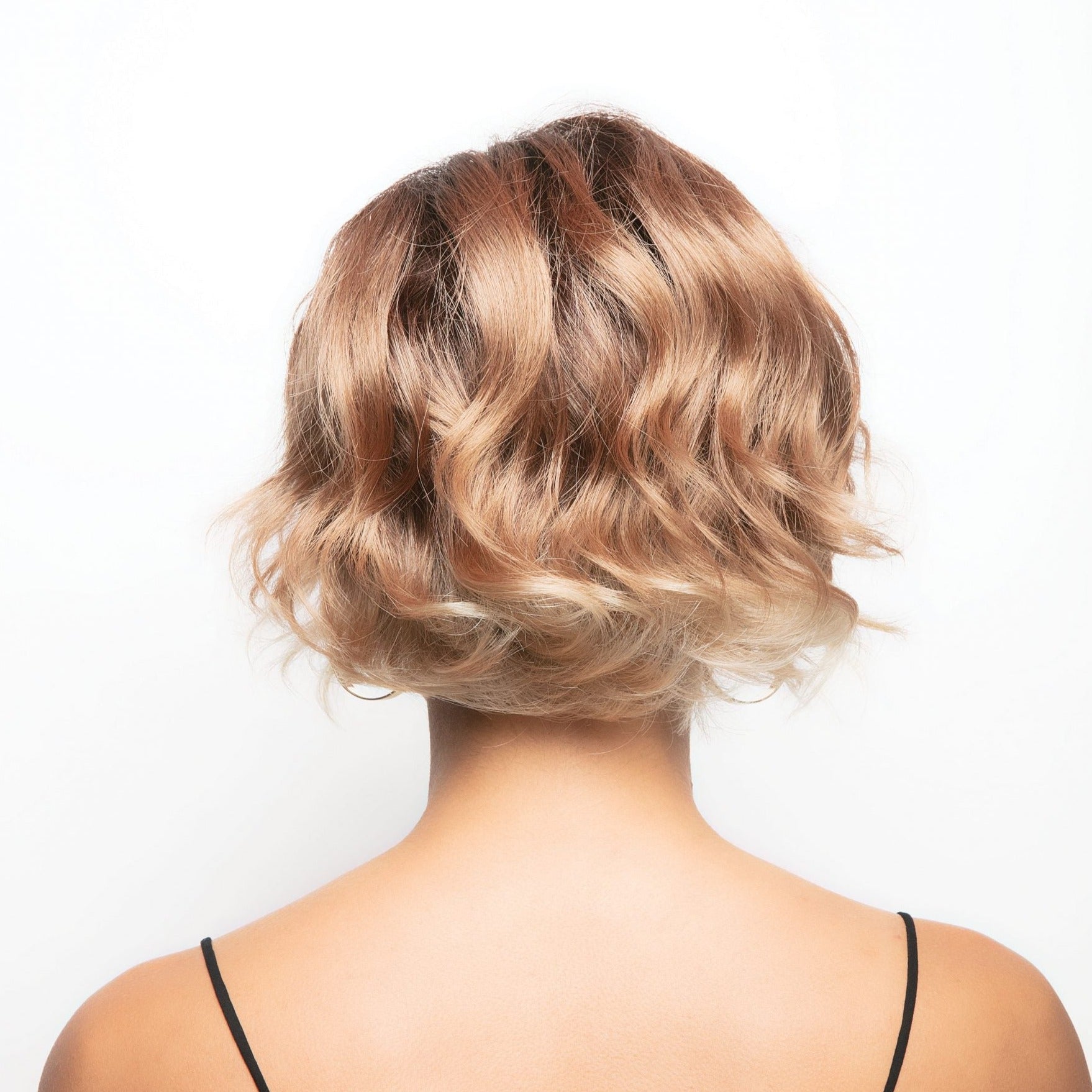 Chin length textured bob with a trendy, side swept fringe. This modern style creates natural volume and movement.