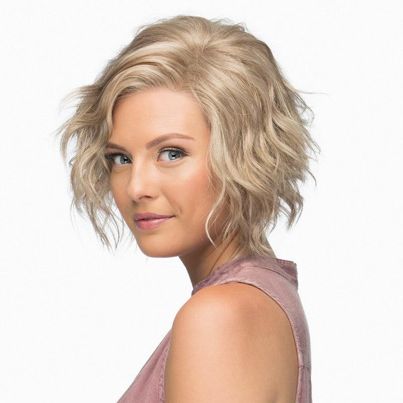Wynter is a short, angled cut bob with long side swept bangs. Texturized waves are paired with choppy layers for an edgy, chic look.